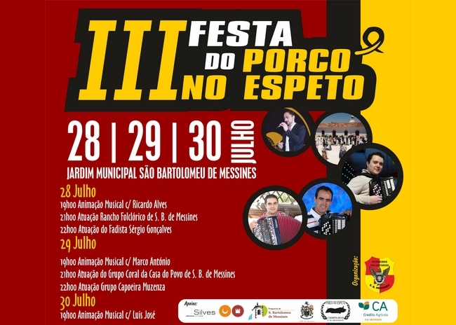 A III Festa do Porco no Espeto, organizada pelos Bombeiros Voluntários de São Bartolomeu de Messines, com o apoio da Câmara Municipal de Silves, terá lugar nos dias 28, 29 e 30 de julho, no Jardim Municipal de SB Messines.