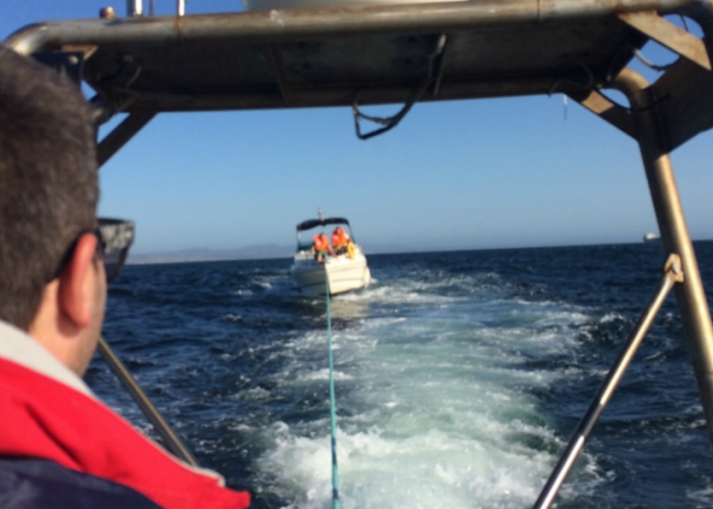 Foi também empenhada a Embarcação de Alta Velocidade “Fronteira” da Policia Marítima, que se dirigiu para o local e, por questões de segurança, acabou por estabelecer reboque para afastar a embarcação das rochas, visto estar já bastante próxima do molhe, rebocando-a até ao porto de recreio.