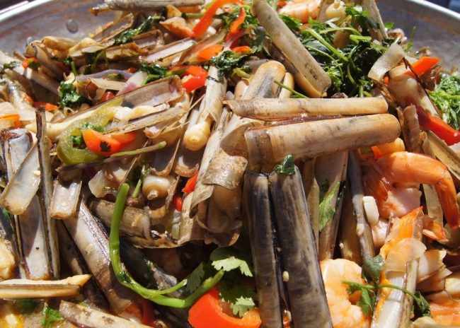 A paragem seguinte foi os Mercados de Olhão. Quem passou por este emblemático local, no dia 15 de agosto, pôde assistir à confeção de uma cataplana de lingueirão e camarão acompanhada de xarém.