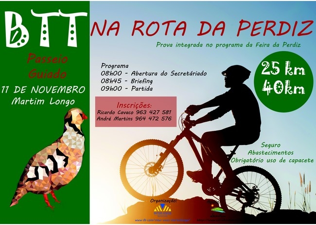 O Passeio BTT na «Rota da Perdiz» realiza-se em Martim Longo, Concelho de Alcoutim no dia 11 de novembro, organizado pela Associação de Jovens do Nordeste Algarvio – Inter-Vivos,