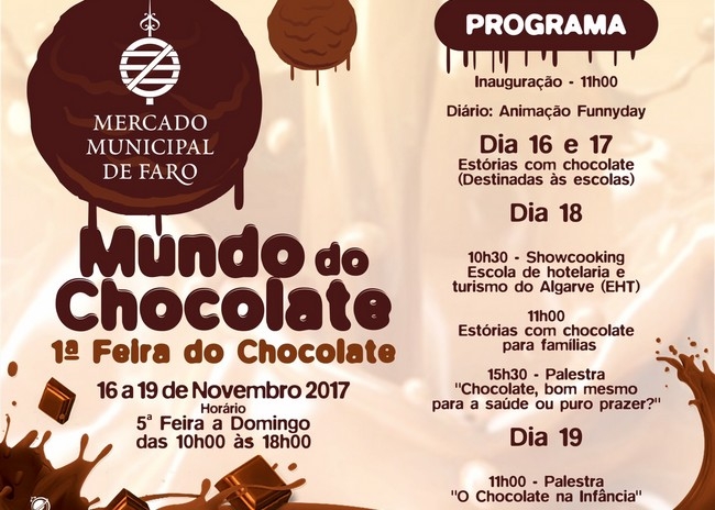 O Mercado Municipal de Faro irá receber, a partir da próxima quinta-feira, 16 de novembro, e até domingo, dia 19, a primeira edição da Feira do Chocolate «Mundo do Chocolate», evento que pretende dinamizar este emblemático local e atrair os mais gulosos à cidade.