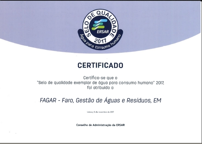O Município de Faro torna público que a ERSAR (Entidade Reguladora dos Serviços de Águas e Resíduos) atribuiu pela primeira vez à empresa municipal FAGAR, EM, o Selo de Qualidade Exemplar da água para consumo humano. A entrega da distinção decorreu no passado dia 08 de Novembro, em cerimónia realizada em Lisboa.