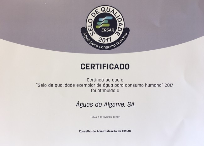 A Águas do Algarve S.A., foi mais uma vez distinguida com a atribuição do «Selo de qualidade exemplar da água para consumo humano" relativo à qualidade da água fornecida no ano 2016.
