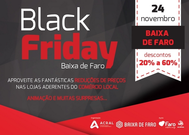 A Black Friday é uma iniciativa da ACRAL – Associação de Comércio e Serviços da Região do Algarve e da ADCZHF - Associação de Desenvolvimento Comercial da Zona Histórica de Faro, com o apoio do Município de Faro. Para mais informações consulte as páginas da ACRAL (https://www.acral.pt/pt/) ou da ADCZHF (www.baixadefaro.pt).