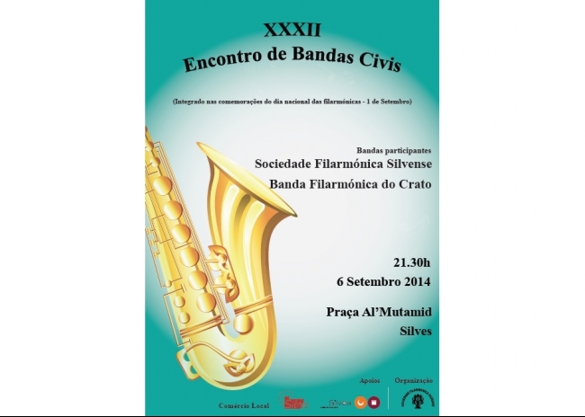 O XXXII Encontro de Bandas de Silves terá lugar no próximo dia 6 de setembro (sábado), na Praça Al-Mutamid em Silves, pelas 21h30. O evento é promovido pela Sociedade Filarmónica Silvense e conta com o apoio do Município de Silves.