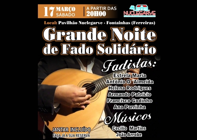 A Nuclegarve, IPSS do Concelho em Albufeira, irá realizar um evento temático, «Grande Noite de Fado Solidário», no próximo dia 17 de março a partir das 20h00, no pavilhão da Nuclegarve, em Fontainhas.
