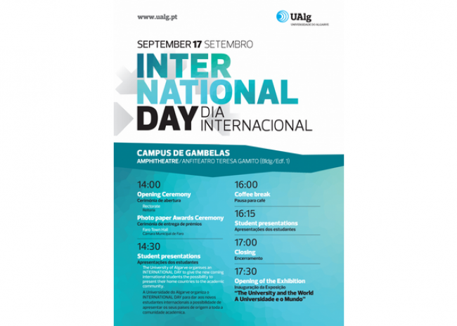A Universidade do Algarve organiza, no dia 17 de setembro, o "International Day", no Anfiteatro Teresa Gamito, Campus de Gambelas (edifício 1), dirigido a toda a comunidade académica, incluindo os estudantes internacionais, que só neste semestre rondam as quatro centenas, de 60 países.