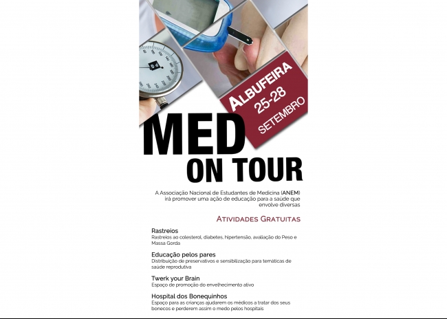 A Associação Nacional de Estudantes de Medicina (ANEM) vai estar em Albufeira de 25 a 28 de setembro para realizar uma ação de educação para a saúde “Med On Tur”. Fique atento ao programa e traga a família e amigos! Juntos, vamos prevenir a doença e promover a saúde da população de Albufeira! A participação é gratuita.