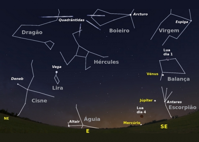 Figura 1: céu a leste pelas 7 horas da madrugada de dia 4 com o radiante da chuva de estrelas Quadrântidas.