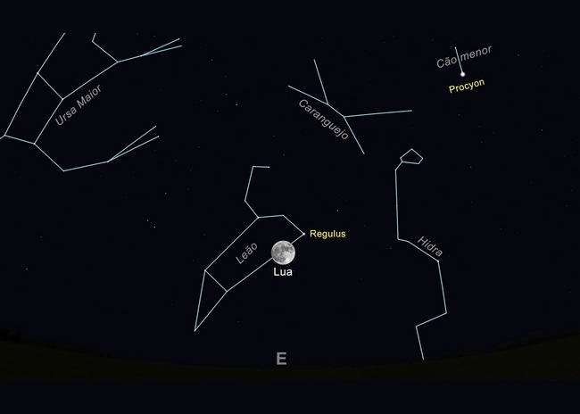 Figura 1: O céu virado a Este, às 20:00 do dia 19 de fevereiro de 2019. A “super” lua cheia está na constelação do Leão, logo abaixo da estrela Regulus (Imagem: Ricardo Cardoso Reis/Stellarium)