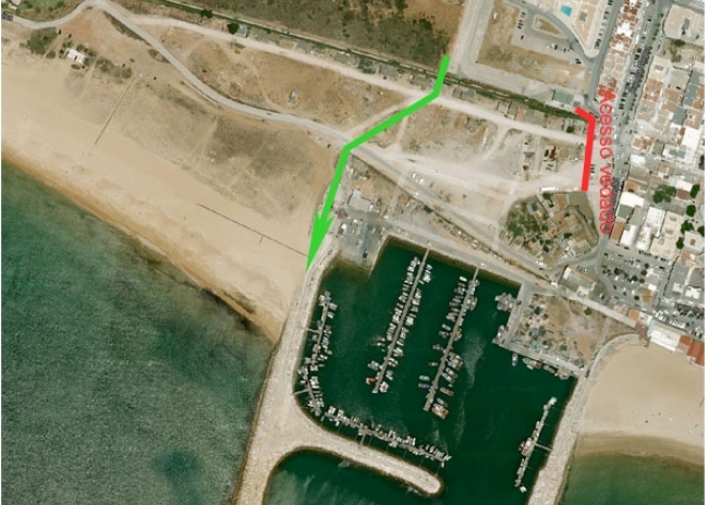 Em virtude do início das obras de requalificação da zona Poente de Quarteira (construção do Passeio das Dunas), o acesso ao local de observação está dificultado pelo inicio da instalação das vedações que irão delimitar a obra (zona a vermelho na figura seguinte).