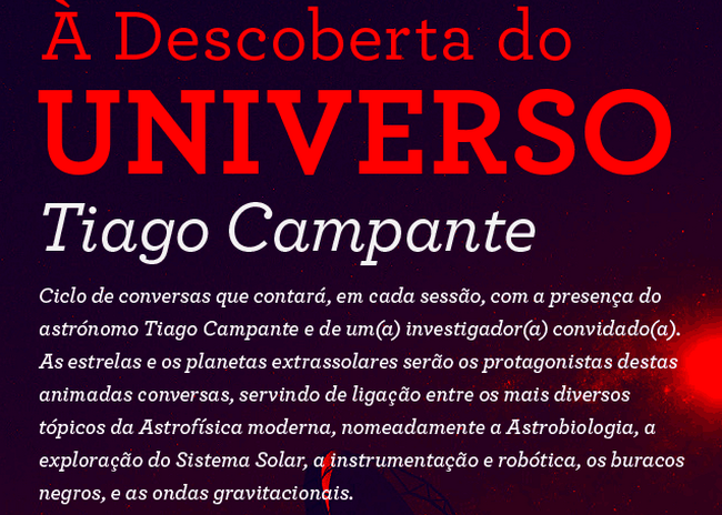 O Ciclo de Conversas que irá decorrer em 15 Centros Ciência Viva, é organizado pelo astrónomo Tiago Campante em parceria com a Agência Ciência Viva / ESERO. Os temas em discussão prendem-se com Astronomia, Astrofísica e Ciências do Espaço. As estrelas e os planetas extrassolares funcionam como elo de ligação a outros temas da Astrofísica moderna, como a Astrobiologia, a exploração do Sistema Solar, instrumentação e robótica, buracos negros e ondas gravitacionais.