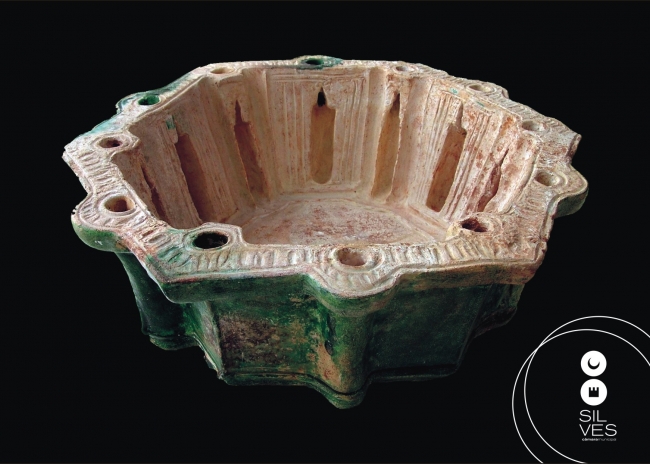 Trata-se de uma peça de acabamento vidrado e decoração estampilhada, com cronologia Almóada (sécs. XII-XIII), proveniente de escavações arqueológicas ocorridas no castelo de Silves sob a direção científica da Prof.ª Doutora Rosa Varela Gomes e com profundos trabalhos de restauro realizados nos serviços de Conservação e Restauro da Câmara Municipal de Silves. O objeto já foi estudado e publicado pela referida arqueóloga que, todavia, lhe atribui diferente funcionalidade e integra as reservas do Museu Municipal de Arqueologia de Silves.