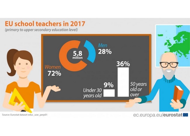 Em 2017, havia 5,8 milhões de professores do ensino básico ao secundário na União Europeia (UE), sendo que 4,2 milhões eram mulheres (72%).