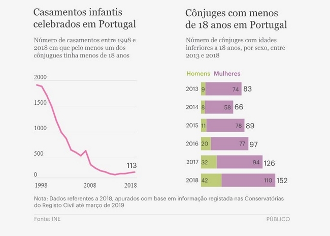 Em 20 anos, em Portugal, percorreu-se um longo caminho no que diz respeito ao casamento infantil. Em 1998, celebraram-se 1.827 casamentos em que pelo menos um dos cônjuges era menor de idade. Dez anos depois, em 2008, foram menos de metade, 532, escreve a publicação, dando conta que o número mais baixo de casamentos infantis registou-se em 2014 – foram apenas 63 casamentos. Os números têm, no entanto, vindo a subir: