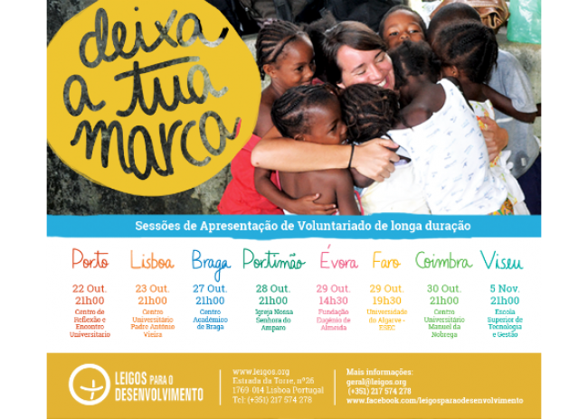 Com o objetivo de apelar ao voluntariado internacional de longa duração e a potenciais interessados numa experiência missionária em África, prestar esclarecimentos e informações, a ONGD Leigos para o Desenvolvimento realiza dia 29 de outubro, pelas 19h30, uma sessão de apresentação e esclarecimento, na Universidade do Algarve - ESEC - Anfiteatro Paulo Freire (Campus da Penha, Faro).