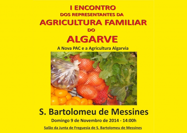 A Confederação Nacional de Agricultura (CNA) promove no próximo domingo, dia 9 de novembro, pelas 14 horas, no salão da Junta de Freguesia de São Bartolomeu de Messines, o 1 Encontro de representantes da agricultura familiar no Algarve, onde será debatido o tem "Politica Agrícola Comum (PAC), e a agricultura algarvia".