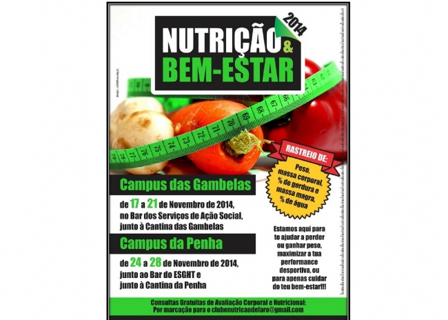 O Gabinete de Desporto da Associação Académica da Universidade do Algarve em parceria com o Clube de Nutrição de Faro convidam toda a comunidade académica, a participar nas Ações de Rastreio: Nutrição e Bem-estar junto aos espaços das cantinas do Campus das Gambelas de 17 a 21 de Novembro e no Campus da Penha de 24 a 28 de Novembro, nesta semana estará também junto ao bar da ESGHT.