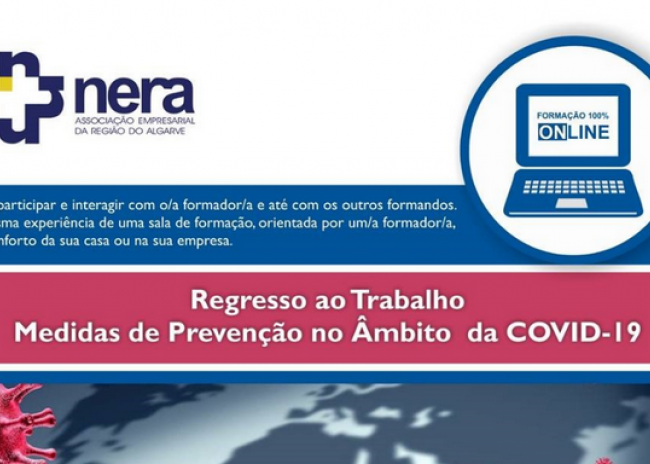 Com o objetivo de dotar os formandos relativamente às medidas de prevenção a adotar na empresa, no âmbito da COVID-19, o NERA irá realizar, nos dias 20, 26, 27, 28 de maio, 03 e 04 de junho de 2020*, entre as 09h00 e as 11h00, a ação de formação: Regresso ao Trabalho - Medidas de Prevenção no Âmbito da COVID-19.