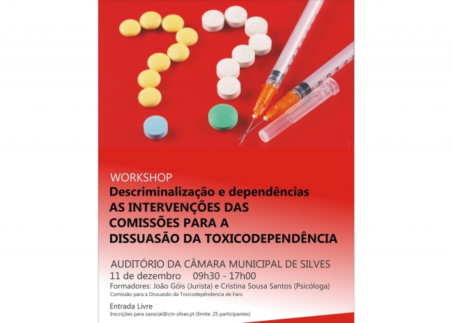 Dissuasão da Toxicodependência (CDT)” é o título de um workshop que terá lugar no próximo dia 11 de dezembro, entre as 09h30 e as 17h00, no Auditório da Câmara Municipal de Silves.