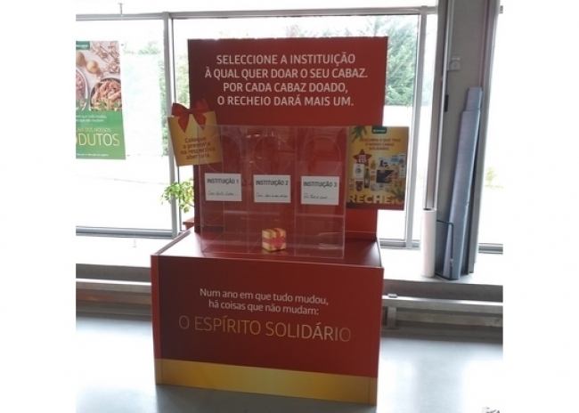 os clientes podem adquirir um cabaz de bens alimentares e doá-lo a uma das três instituições locais identificadas em cada loja, oferecendo o Recheio um segundo cabaz à instituição escolhida.