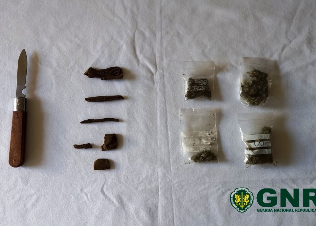 No decorrer de uma ação de policiamento, os militares da Guarda abordaram um grupo de indivíduos que se encontravam num local referenciado pelo tráfico e consumo de droga, os quais adotaram uma postura suspeita perante a presença da patrulha. Durante a fiscalização, os militares encontraram produto estupefaciente na posse de dois indivíduos, os quais foram detidos, tendo sido apreendidas cinco doses de liamba, 26 doses de haxixe e uma faca.