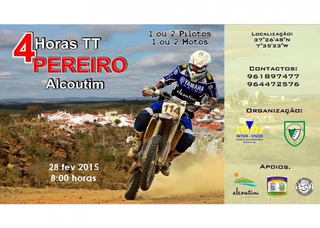O concelho de Alcoutim vai ser palco, no dia 28 de fevereiro, da prova de resistência “4 Horas TT Pereiro – Alcoutim”. A competição de todo o terreno para motos é uma organização conjunta da associação Inter-vivos - Associação de Jovens do Nordeste Algarvio e do Grupo Desportivo de Alcoutim em colaboração com a Câmara Municipal de Alcoutim.