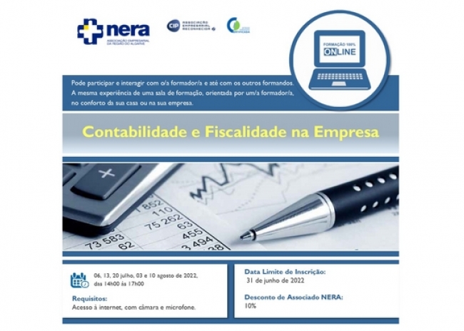 Com o objetivo de conhecer as obrigações em matéria de contabilidade e aprender a linguagem contabilística, o NERA irá realizar, nos dias 06, 13, 20 julho, 03 e 10 de agosto de 2022, a ação e formação: Contabilidade e Fiscalidade na Empresa.