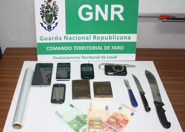 Para além do produto estupefaciente, foram ainda apreendidas ao indivíduo duas facas, quatro telemóveis, uma máquina fotográfica e 160 euros em moeda do BCE.