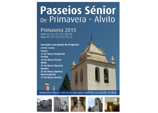 Com a chegada da Primavera, o Município de Olhão dá continuidade ao projeto “Passeios Sénior” e promove nos meses de abril e maio várias visitas à vila alentejana de Alvito. Todos os interessados, a partir dos 60 anos e residentes no concelho de Olhão, podem inscrever-se entre os dias 23 e 27 de março.
