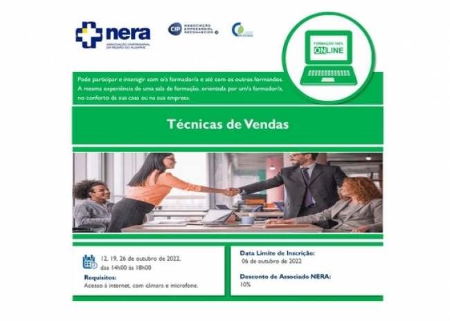 Com o objetivo de dotar os participantes de competências para planear/organizar a atividade de venda e prospeção para obtenção de uma abordagem efetiva, desenvolver com eficácia o processo de venda, utilizando técnicas que garantam vendas efetivas, conduzir diálogos e compreender a importância e os princípios do empowerment num profissional de vendas, o NERA irá realizar, nos dias 12, 19 e 26 de outubro de 2022, a ação de formação: Técnicas de Vendas.