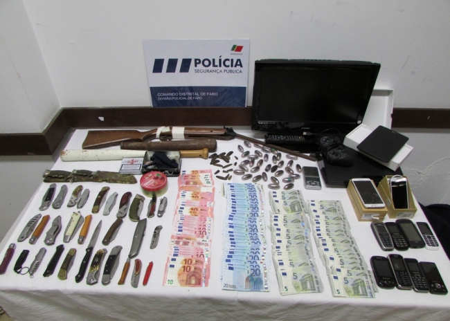- Em Faro, na sequência de investigação levado a cabo pela Esquadra de Investigação Criminal (2 meses), sobre venda de Produto Estupefaciente à comunidade estudantil de Faro, concretamente junto de Escolas Secundárias desta cidade, deu-se cumprimento a Mandado de Busca e Apreensão, tendo sido apreendido 390 gramas de Haxixe em Bolotas, o equivalente a 780 doses no valor de 1600€ (mil e seiscentos euros), cerca de 1500€ em notas do Banco Central Europeu, cerca de 25 armas brancas entre elas, punhais, facas automáticas, canivetes e outros, telemóveis e outras armas por uso.