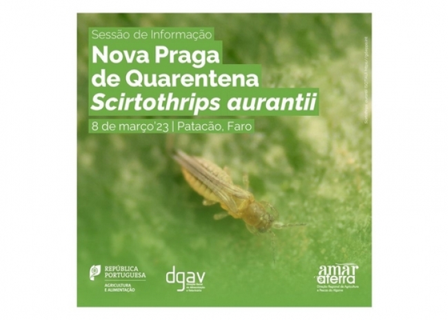 Sessão de Informação sobre a Nova Praga de Quarentena Scirtothrips aurantii , agendada para o dia 8 de março, nas instalações da DRAP Algarve (Patacão), entre as 14h30 e as 17h00, através de sessão presencial numa parceria entre a DGAV e a DRAPALGARVE.