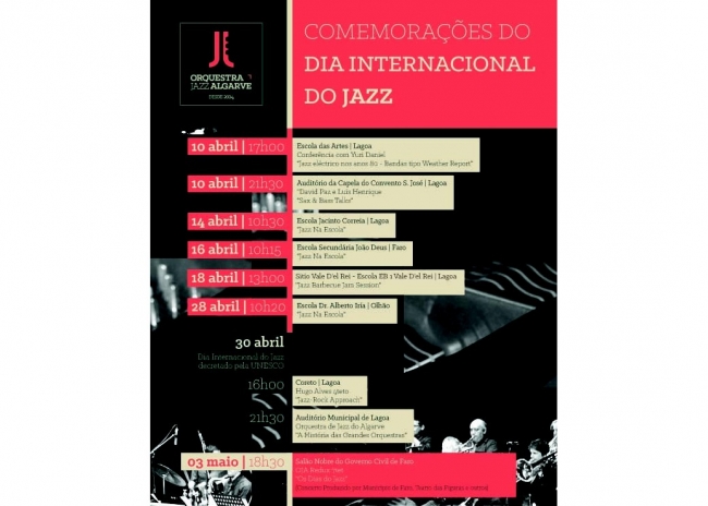 Este ano, a Orquestra de Jazz do Algarve volta a associar-se a esta data como não podia deixar de ser, mas com uma programação mais abrangente, e que prova precisamente a nossa versatilidade e influência na Região do Algarve. Este mês as nossas atividades e Concertos serão levadas a três Concelhos do Algarve, Olhão, Faro e Lagoa, de acordo com o cartaz anexo.