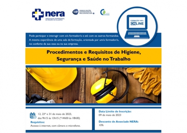 Com o objetivo de promover a formação aos trabalhadores e demais intervenientes nos locais de trabalho, possibilitando a aquisição de competências ao nível da identificação e prevenção dos riscos profissionais, o NERA irá realizar, nos dias 12, 23* e 31 de maio de 2023, a ação de formação: Procedimentos e Requisitos de Higiene, Segurança e Saúde no Trabalho.