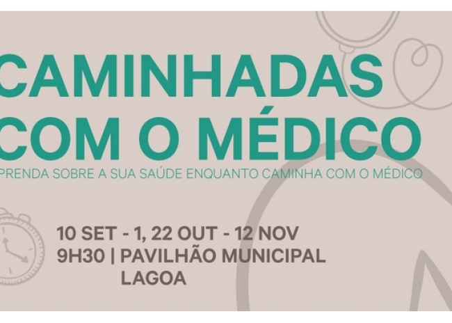 As “Caminhadas com o Médico” terão lugar nos dias 10 de setembro, 01 e 22 de outubro e no dia 12 de novembro, sempre com início pelas 09h30 e ponto de encontro no Pavilhão Desportivo Municipal Jacinto Correia, em Lagoa.