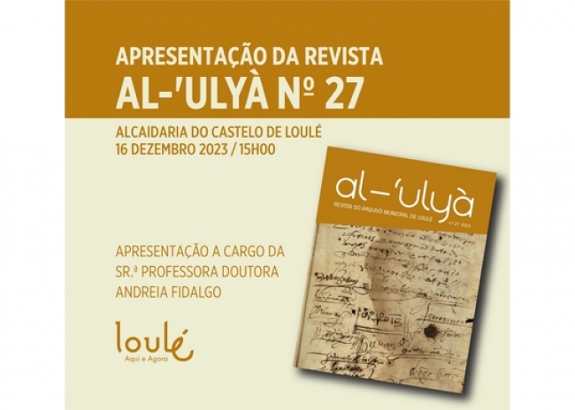 É apresentada no próximo sábado, 16 de dezembro, pelas 15h00, na Alcaidaria do Castelo de Loulé, a Revista Al-Ulyà Nº27, publicação de investigação científica interdisciplinar e de divulgação cultural, edição da Autarquia de Loulé.