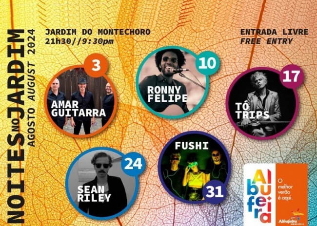 A partir do dia 3, o Jardim de Montechoro recebe, mais uma vez, o programa musical “Noites no Jardim”. Trata-se de um ciclo de concertos de caráter mais intimista, ao ar livre, num espaço emblemático da cidade. Do programa constam cinco espetáculos musicais de entrada livre, que têm início sempre às 21h30. O duo Amar Guitarra sobe ao palco no primeiro dia do programa, mas estão, igualmente, agendadas as atuações de Ronny Felipe (10 de agosto), Tó Trips (17 de agosto), Sean Riley (24 de agosto) e Fushi (31 de agosto). A iniciativa tem por objetivo animar as noites de verão e promover a música portuguesa.