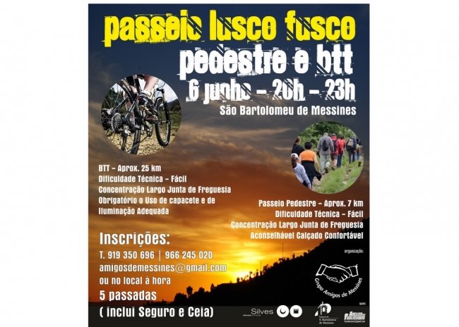 O Grupo Amigos de Messines irá promover no próximo dia 6 de junho, o Passeio Lusco Fusco – pedestre e BTT. A iniciativa decorre em SB Messines, entre as 20h00 e as 23h00, e conta com o apoio da Câmara Municipal de Silves.