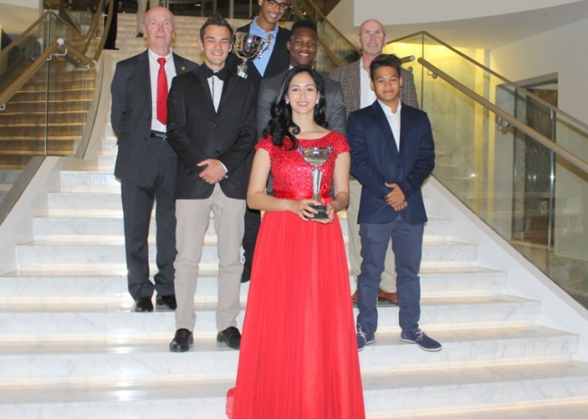 Na foto: Marta Castanheira da Escola Secundária Dra. Laura Ayres de Quarteira, exibe a taça do 1.º lugar, referente à equipa vencedora, acompanhados pelos Rotários de Almancil e Silves – Peter Hinze e Alan Winn.