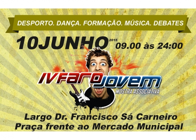 No próximo dia 10 de Junho, entre as 09h00 e as 24h00, irá decorrer o evento “Faro Jovem”, no largo frente ao Mercado Municipal de Faro, organizado pela Câmara Municipal de Faro e pelo Juvfaro- Conselho Municipal de Juventude do Município.