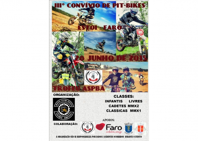 Realiza-se no próximo dia 28 de Junho, em Estoi, o Convívio de Pit-Bikes, prova inserida no campeonato regional ASPBA, em que jovens atletas competem em diversas categorias (Infantis, Cadetes, MMX1,MMX2,Clássicas e Livres).