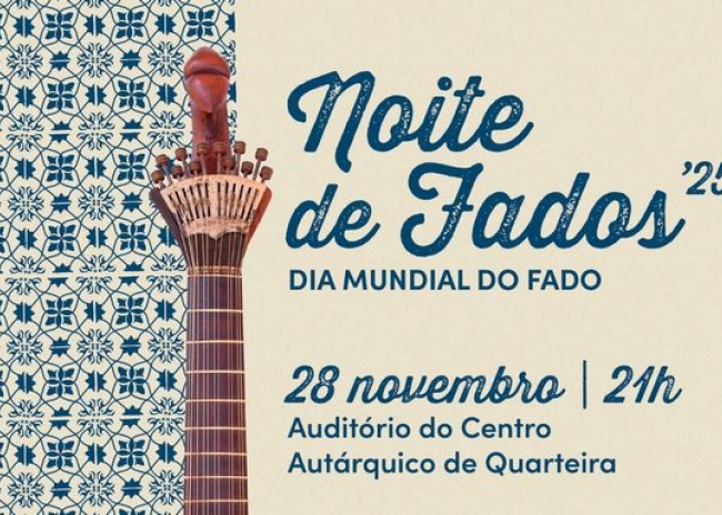 O Auditório do Centro Autárquico de Quarteira recebe a 2.ª edição da Noite de Fados na noite do dia 28 de novembro, pelas 21h00. Esta celebração do Dia Mundial do Fado conta com atuações dos fadistas Luís Manhita e Nádia Catarro, acompanhados por Gonçalo Narciso na guitarra portuguesa e Luís Reis na viola de fado.