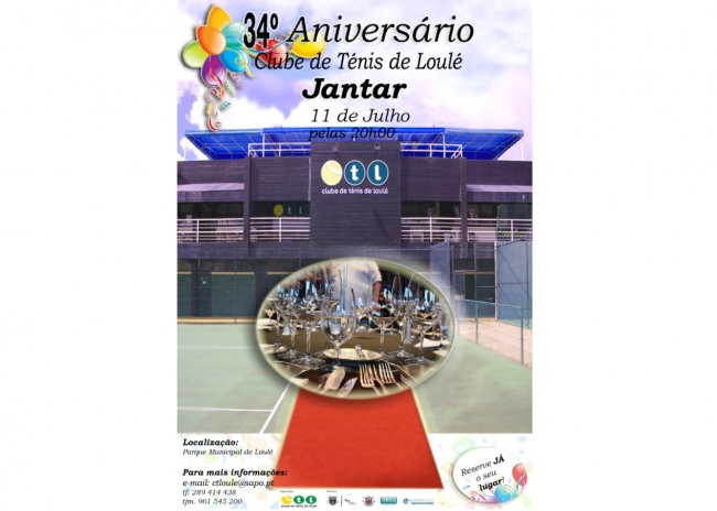 No próximo sábado, dia 11 de julho, terá lugar nas instalações do Clube de Ténis de Loulé a comemoração do seu 34º Aniversário, com início pelas 20H00.