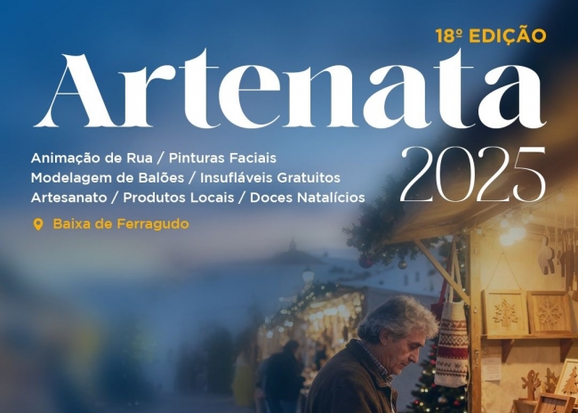 A Junta de Freguesia de Ferragudo tem o prazer de anunciar a 18.ª edição da Artenata, que terá lugar nos dias 29, 30 de novembro e 1 de dezembro de 2025, no Largo Rainha D. Leonor e ruas circundantes. Agradecemos, desde já, a divulgação desta iniciativa junto do público.