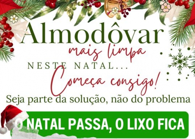 A Câmara Municipal de Almodôvar lança, nesta quadra festiva, a campanha «Almodôvar Mais Limpa Neste Natal – Começa Consigo!», uma iniciativa que pretende sensibilizar famílias, comerciantes e visitantes para a adoção de boas práticas no depósito e separação de resíduos.
