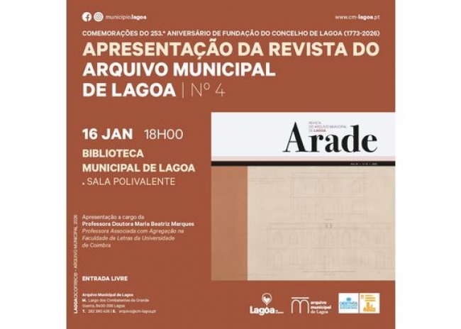 No contexto das comemorações do 253.º aniversário de fundação do concelho de Lagoa, terá lugar no dia 16 de janeiro de 2026 (sexta-feira), pelas 18h00, na sala polivalente da Biblioteca Municipal de Lagoa, a apresentação pública do número 4 d Arade.