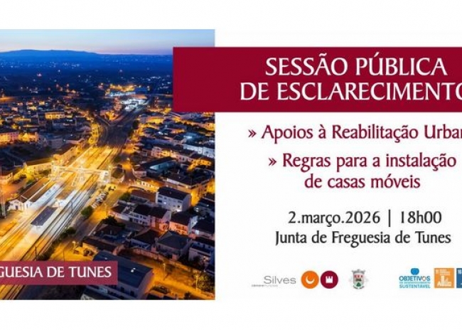 O Município de Silves, em colaboração com a Freguesia de Tunes, vai realizar uma sessão pública de esclarecimento referente aos apoios à reabilitação urbana e às regras para a instalação de casas móveis, no próximo dia 02 de março de 2026, pelas 18:00 horas, nas instalações da Junta de Freguesia de Tunes.
