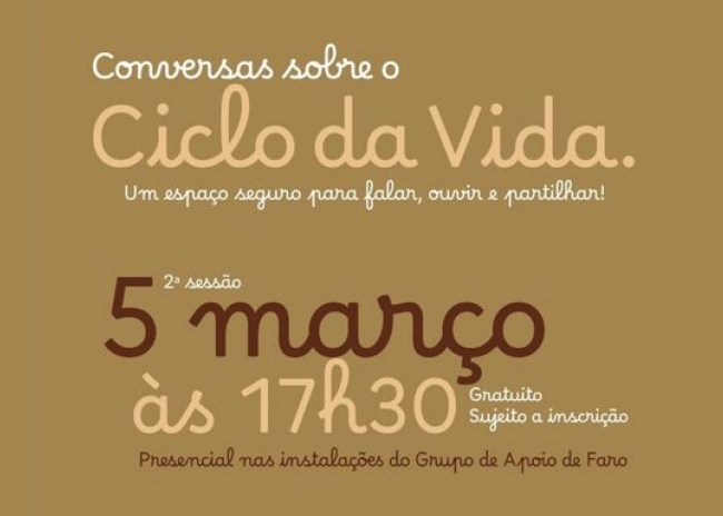 O Núcleo Regional do Sul da Liga Portuguesa Contra o Cancro, através do Grupo de Apoio de Faro, promove no dia 5 de março, às 17h30, uma nova sessão da iniciativa “Conversas sobre o Ciclo da Vida – Espaço seguro para falar, ouvir e partilhar!”. O encontro terá lugar nas instalações do Núcleo Regional de Faro da Liga Portuguesa Contra o Cancro.