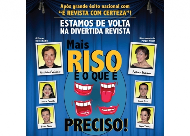 Após o grande êxito "É Revista, com certeza!” que se apresentou em todo o país ao longo do ano passado, este ano a produtora Sonho à Cena apresenta a divertida comédia "Mais riso é o que é preciso!", que assinala o regresso aos palcos do veterano rei da rádio António Calvário. O espetáculo realiza-se dia 31 julho (sexta-feira), pelas 21h30, no Auditório Municipal de Albufeira.